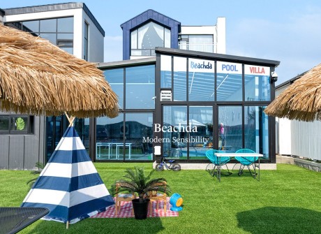 다양한 놀이공간이 있는 키즈존과 넓은 바다를 한눈에 볼 수 있는 오션뷰 테라스가 있는 이곳은 대부도에 위치한 비치다입니다.